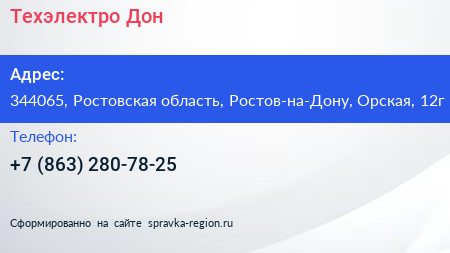 Техэлектро-Дон по адресу 344065, Ростовская область, Ростов-на-Дону, Орская, 12г в дальнейшем Организация, размещена в следующих категориях: