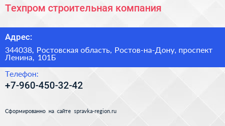 Техпром, строительная компания по адресу 344038, Ростовская область, Ростов-на-Дону, проспект Ленина, 101Б в дальнейшем Организация, размещена в следующих категориях: