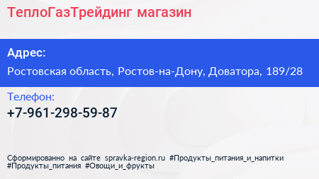 ТеплоГазТрейдинг, магазин по адресу Ростовская область, Ростов-на-Дону, Доватора, 189/28 в дальнейшем Организация, размещена в следующих категориях:
