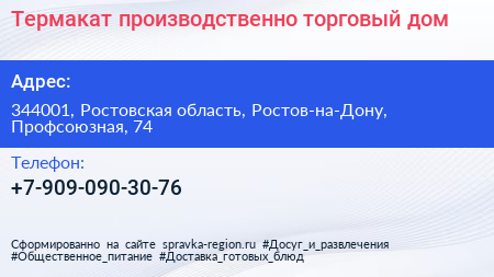 Термакат, производственно-торговый дом по адресу 344001, Ростовская область, Ростов-на-Дону, Профсоюзная, 74 в дальнейшем Организация, размещена в следующих категориях: