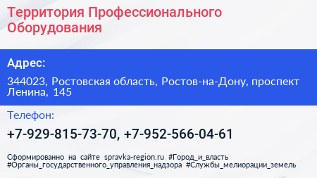Территория Профессионального Оборудования по адресу 344023, Ростовская область, Ростов-на-Дону, проспект Ленина, 145 в дальнейшем Организация, размещена в следующих категориях: