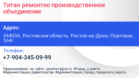 Титан, ремонтно-производственное объединение по адресу 344034, Ростовская область, Ростов-на-Дону, Портовая, 164г в дальнейшем Организация, размещена в следующих категориях: