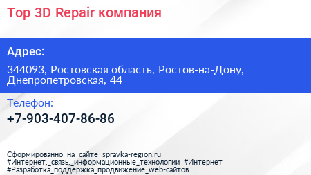 Top 3D Repair, компания по адресу 344093, Ростовская область, Ростов-на-Дону, Днепропетровская, 44 в дальнейшем Организация, размещена в следующих категориях: