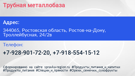 Трубная металлобаза по адресу 344065, Ростовская область, Ростов-на-Дону, Троллейбусная, 24/2в в дальнейшем Организация, размещена в следующих категориях: