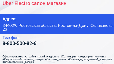 Uber Electro, салон-магазин по адресу 344029, Ростовская область, Ростов-на-Дону, Селиванова, 23 в дальнейшем Организация, размещена в следующих категориях: