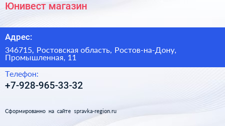 Юнивест, магазин по адресу 346715, Ростовская область, Ростов-на-Дону, Промышленная, 11 в дальнейшем Организация, размещена в следующих категориях: