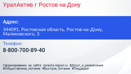 УралАктив, г. Ростов-на-Дону по адресу 344091, Ростовская область, Ростов-на-Дону, Малиновского, 3 в дальнейшем Организация, размещена в следующих категориях: