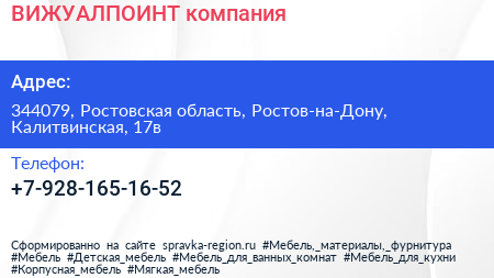 ВИЖУАЛПОИНТ, компания по адресу 344079, Ростовская область, Ростов-на-Дону, Калитвинская, 17в в дальнейшем Организация, размещена в следующих категориях: