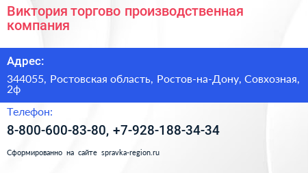 Виктория, торгово-производственная компания по адресу 344055, Ростовская область, Ростов-на-Дону, Совхозная, 2ф в дальнейшем Организация, размещена в следующих категориях:
