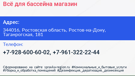 Всё для бассейна, магазин по адресу 344016, Ростовская область, Ростов-на-Дону, Таганрогская, 181 в дальнейшем Организация, размещена в следующих категориях: