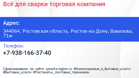 Всё для сварки, торговая компания по адресу 344064, Ростовская область, Ростов-на-Дону, Вавилова, 71ж в дальнейшем Организация, размещена в следующих категориях: