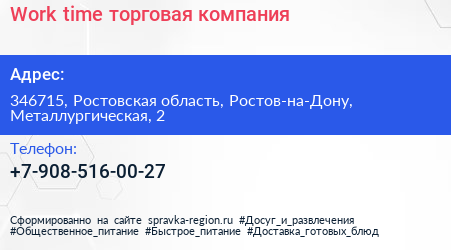 Work time, торговая компания по адресу 346715, Ростовская область, Ростов-на-Дону, Металлургическая, 2 в дальнейшем Организация, размещена в следующих категориях: