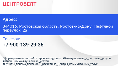 ЦЕНТРОБЕЛТ по адресу 344016, Ростовская область, Ростов-на-Дону, Нефтяной переулок, 2а в дальнейшем Организация, размещена в следующих категориях: