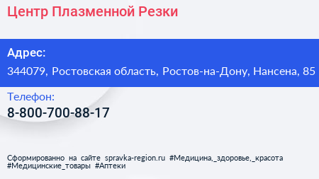 Центр Плазменной Резки по адресу 344079, Ростовская область, Ростов-на-Дону, Нансена, 85 в дальнейшем Организация, размещена в следующих категориях: