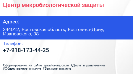 Центр микробиологической защиты по адресу 344012, Ростовская область, Ростов-на-Дону, Ивановского, 38 в дальнейшем Организация, размещена в следующих категориях:
