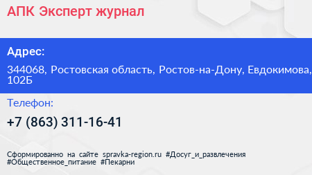 АПК Эксперт, журнал по адресу 344068, Ростовская область, Ростов-на-Дону, Евдокимова, 102Б в дальнейшем Организация, размещена в следующих категориях: