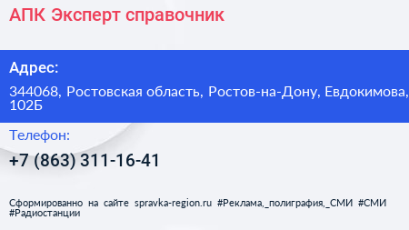 АПК Эксперт, справочник по адресу 344068, Ростовская область, Ростов-на-Дону, Евдокимова, 102Б в дальнейшем Организация, размещена в следующих категориях: