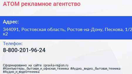 АТОМ, рекламное агентство по адресу 344091, Ростовская область, Ростов-на-Дону, Пескова, 1/2 к2 в дальнейшем Организация, размещена в следующих категориях: