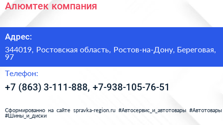Алюмтек, компания по адресу 344019, Ростовская область, Ростов-на-Дону, Береговая, 97 в дальнейшем Организация, размещена в следующих категориях: