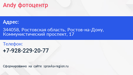 Andy, фотоцентр по адресу 344058, Ростовская область, Ростов-на-Дону, Коммунистический проспект, 17 в дальнейшем Организация, размещена в следующих категориях:
