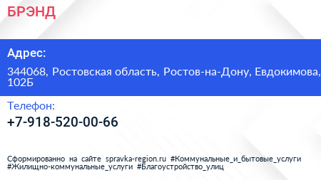 БРЭНД по адресу 344068, Ростовская область, Ростов-на-Дону, Евдокимова, 102Б в дальнейшем Организация, размещена в следующих категориях: