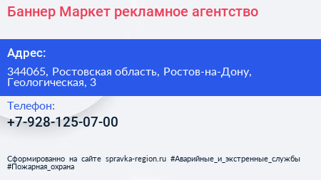 Баннер-Маркет, рекламное агентство по адресу 344065, Ростовская область, Ростов-на-Дону, Геологическая, 3 в дальнейшем Организация, размещена в следующих категориях: