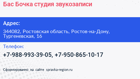 Бас Бочка, студия звукозаписи по адресу 344082, Ростовская область, Ростов-на-Дону, Тургеневская, 16 в дальнейшем Организация, размещена в следующих категориях: