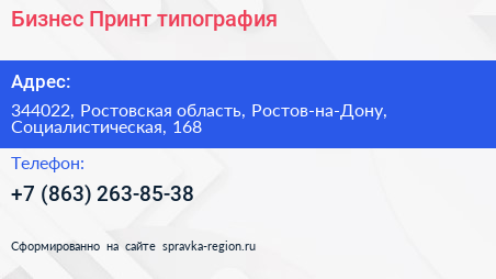 Бизнес Принт, типография по адресу 344022, Ростовская область, Ростов-на-Дону, Социалистическая, 168 в дальнейшем Организация, размещена в следующих категориях: