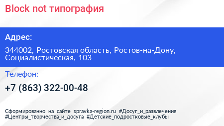 Block-not, типография по адресу 344002, Ростовская область, Ростов-на-Дону, Социалистическая, 103 в дальнейшем Организация, размещена в следующих категориях: