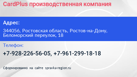 CardPlus, производственная компания по адресу 344056, Ростовская область, Ростов-на-Дону, Беломорский переулок, 18 в дальнейшем Организация, размещена в следующих категориях: