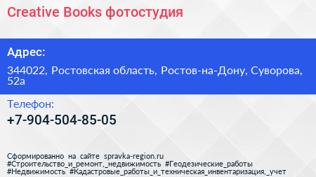 Creative Books, фотостудия по адресу 344022, Ростовская область, Ростов-на-Дону, Суворова, 52а в дальнейшем Организация, размещена в следующих категориях:
