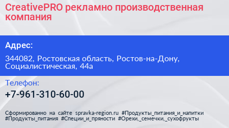 CreativePRO, рекламно-производственная компания по адресу 344082, Ростовская область, Ростов-на-Дону, Социалистическая, 44а в дальнейшем Организация, размещена в следующих категориях: