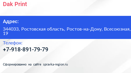 Dak Print по адресу 344033, Ростовская область, Ростов-на-Дону, Всесоюзная, 19 в дальнейшем Организация, размещена в следующих категориях: