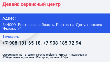 Девайс, сервисный центр по адресу 344000, Ростовская область, Ростов-на-Дону, проспект Чехова, 94 в дальнейшем Организация, размещена в следующих категориях: