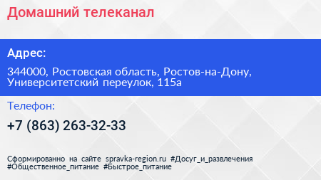 Домашний, телеканал по адресу 344000, Ростовская область, Ростов-на-Дону, Университетский переулок, 115а в дальнейшем Организация, размещена в следующих категориях: