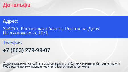 Дональфа по адресу 344095, Ростовская область, Ростов-на-Дону, Штахановского, 10/1 в дальнейшем Организация, размещена в следующих категориях: