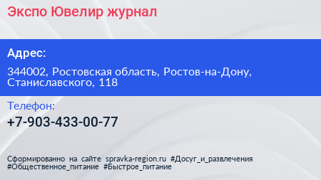 Экспо-Ювелир, журнал по адресу 344002, Ростовская область, Ростов-на-Дону, Станиславского, 118 в дальнейшем Организация, размещена в следующих категориях:
