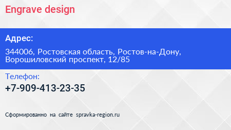 Engrave design по адресу 344006, Ростовская область, Ростов-на-Дону, Ворошиловский проспект, 12/85 в дальнейшем Организация, размещена в следующих категориях: