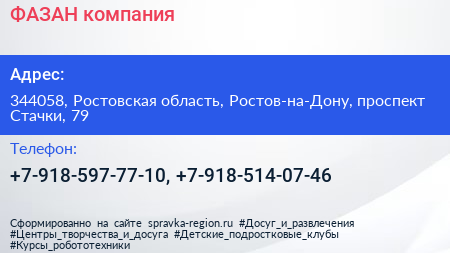 ФАЗАН, компания по адресу 344058, Ростовская область, Ростов-на-Дону, проспект Стачки, 79 в дальнейшем Организация, размещена в следующих категориях: