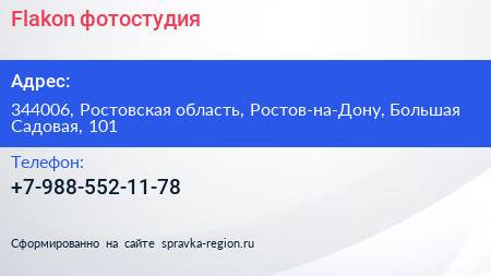 Flakon, фотостудия по адресу 344006, Ростовская область, Ростов-на-Дону, Большая Садовая, 101 в дальнейшем Организация, размещена в следующих категориях: