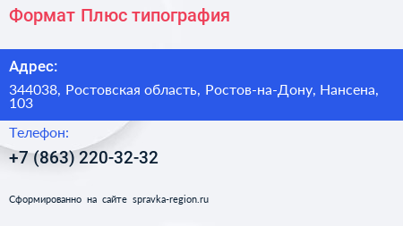 Формат Плюс, типография по адресу 344038, Ростовская область, Ростов-на-Дону, Нансена, 103 в дальнейшем Организация, размещена в следующих категориях: