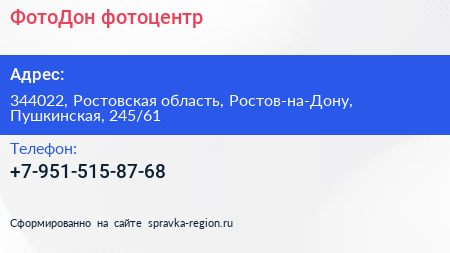 ФотоДон, фотоцентр по адресу 344022, Ростовская область, Ростов-на-Дону, Пушкинская, 245/61 в дальнейшем Организация, размещена в следующих категориях:
