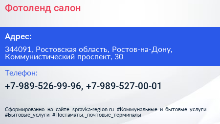 Фотоленд, салон по адресу 344091, Ростовская область, Ростов-на-Дону, Коммунистический проспект, 30 в дальнейшем Организация, размещена в следующих категориях: