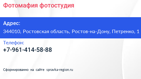 Фотомафия, фотостудия по адресу 344010, Ростовская область, Ростов-на-Дону, Петренко, 1 в дальнейшем Организация, размещена в следующих категориях: