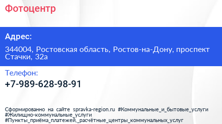 Фотоцентр по адресу 344004, Ростовская область, Ростов-на-Дону, проспект Стачки, 32а в дальнейшем Организация, размещена в следующих категориях: