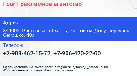 FourT, рекламное агентство по адресу 344002, Ростовская область, Ростов-на-Дону, переулок Семашко, 48а в дальнейшем Организация, размещена в следующих категориях: