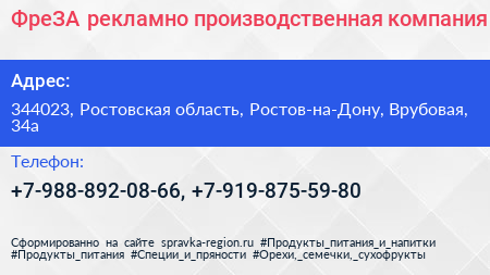 ФреЗА, рекламно-производственная компания по адресу 344023, Ростовская область, Ростов-на-Дону, Врубовая, 34а в дальнейшем Организация, размещена в следующих категориях: