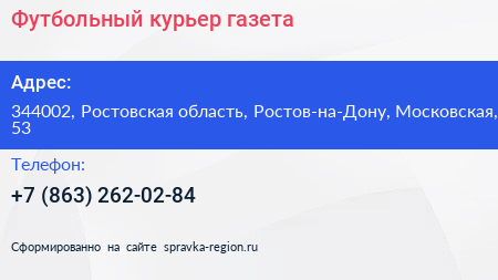 Футбольный курьер, газета по адресу 344002, Ростовская область, Ростов-на-Дону, Московская, 53 в дальнейшем Организация, размещена в следующих категориях: