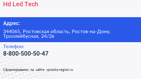 Hd Led Tech по адресу 344065, Ростовская область, Ростов-на-Дону, Троллейбусная, 24/2в в дальнейшем Организация, размещена в следующих категориях: