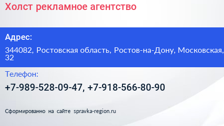 Холст, рекламное агентство по адресу 344082, Ростовская область, Ростов-на-Дону, Московская, 32 в дальнейшем Организация, размещена в следующих категориях: